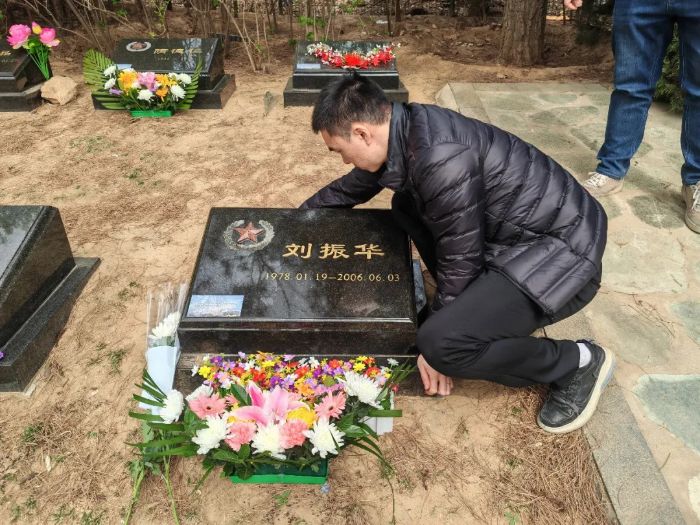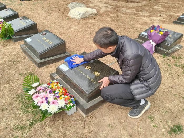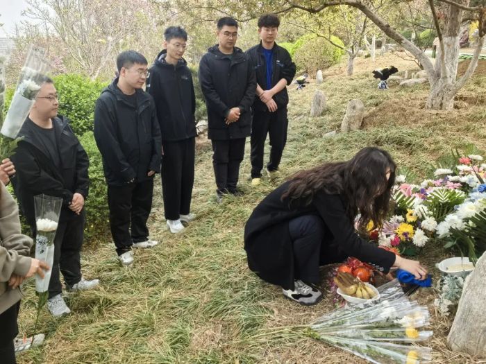墓前,团员青年肃立默哀,轻拭墓碑,敬献鲜花,行三鞠躬礼,寄托无尽哀思。