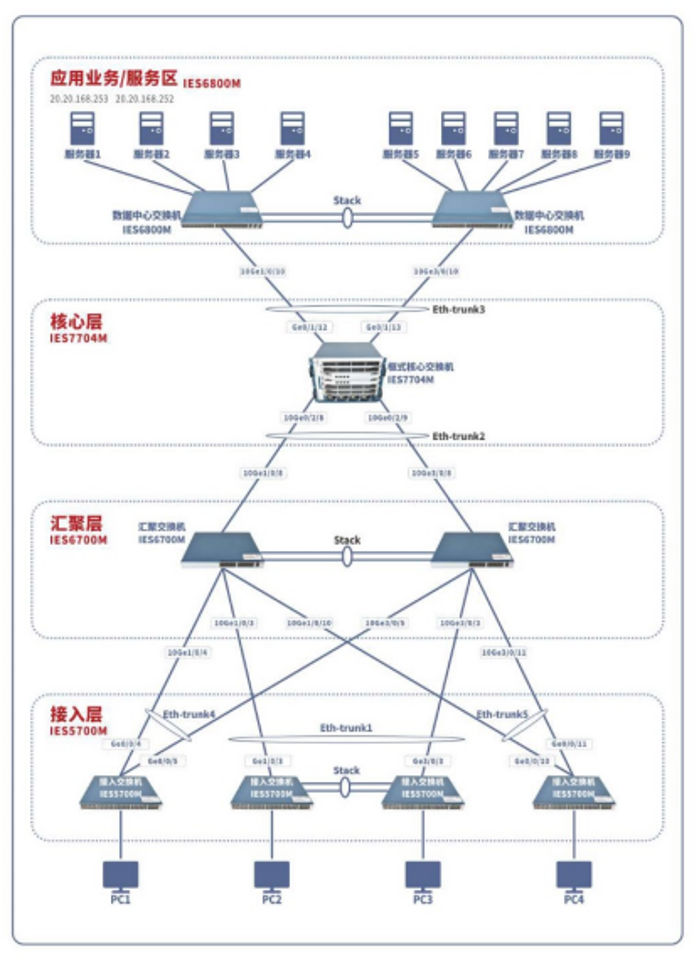 ●核心层交换机使用框式IES7704M,采用上下链路汇聚接入服务器端和汇聚端。核心交换机通过链路聚合方式与数据中心交换机IES6800M连接,IES6800M交换机连接各种服务器。
